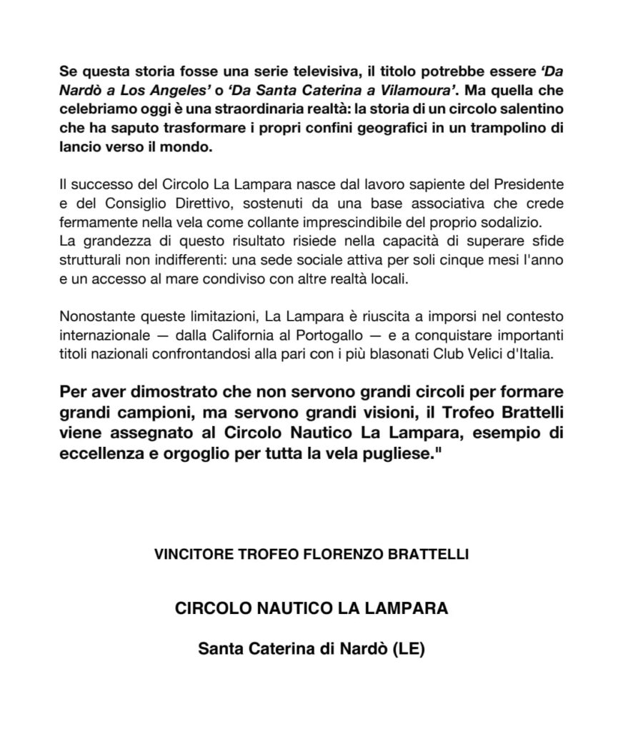 Per questi valori, il Trofeo Florenzo Brattelli è stato assegnato al Circolo Nautico La Lampara, indicato come esempio di eccellenza, progettualità e orgoglio per tutta la vela pugliese.