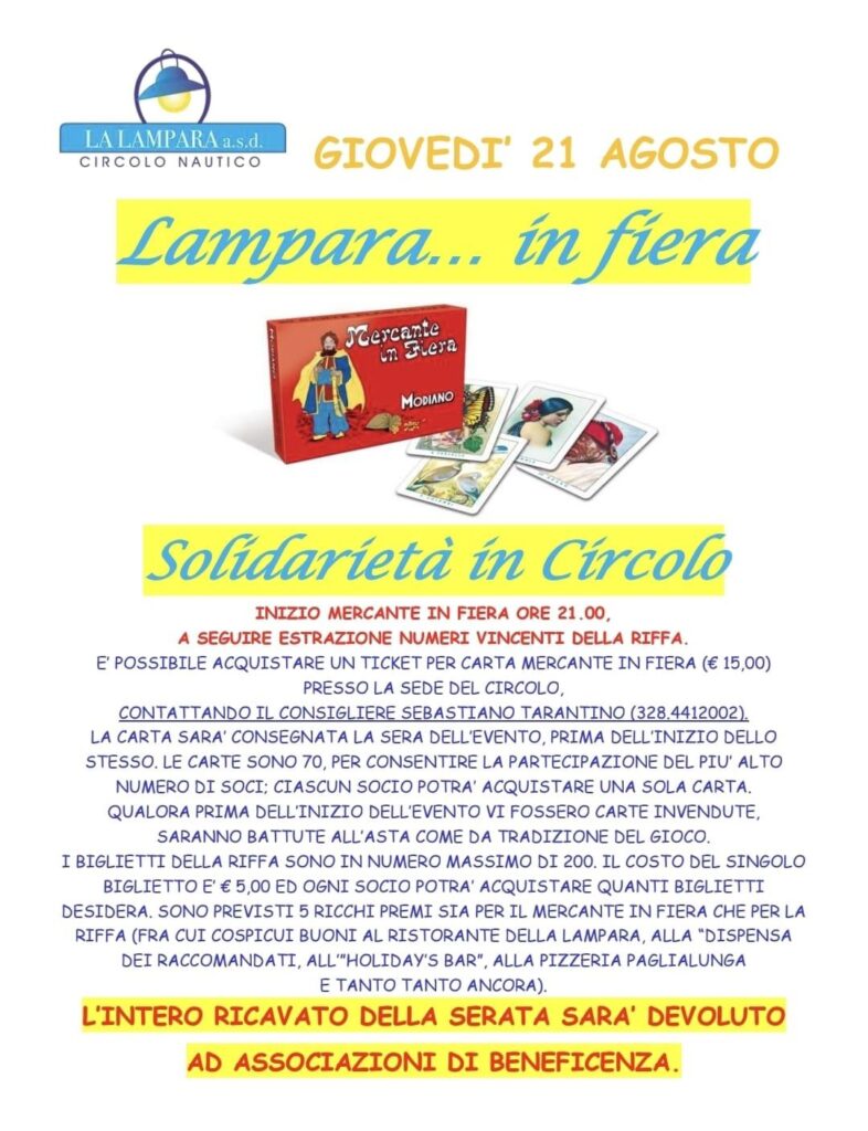 Il primo appuntamento è in programma oggi, 21 agosto, presso la sede sociale del circolo, dove si terrà l’evento “Lampara in Fiera… Solidarietà in Circolo”. Nel corso della serata avrà luogo una grande lotteria benefica, resa possibile grazie alla generosità dei soci e di amici del circolo, che hanno messo a disposizione numerosi premi. Tutto il ricavato derivante dalla vendita delle carte e dei biglietti sarà interamente devoluto a due realtà di grande importanza sul territorio: AMO Puglia Lecce e la Caritas Diocesana di Nardò.