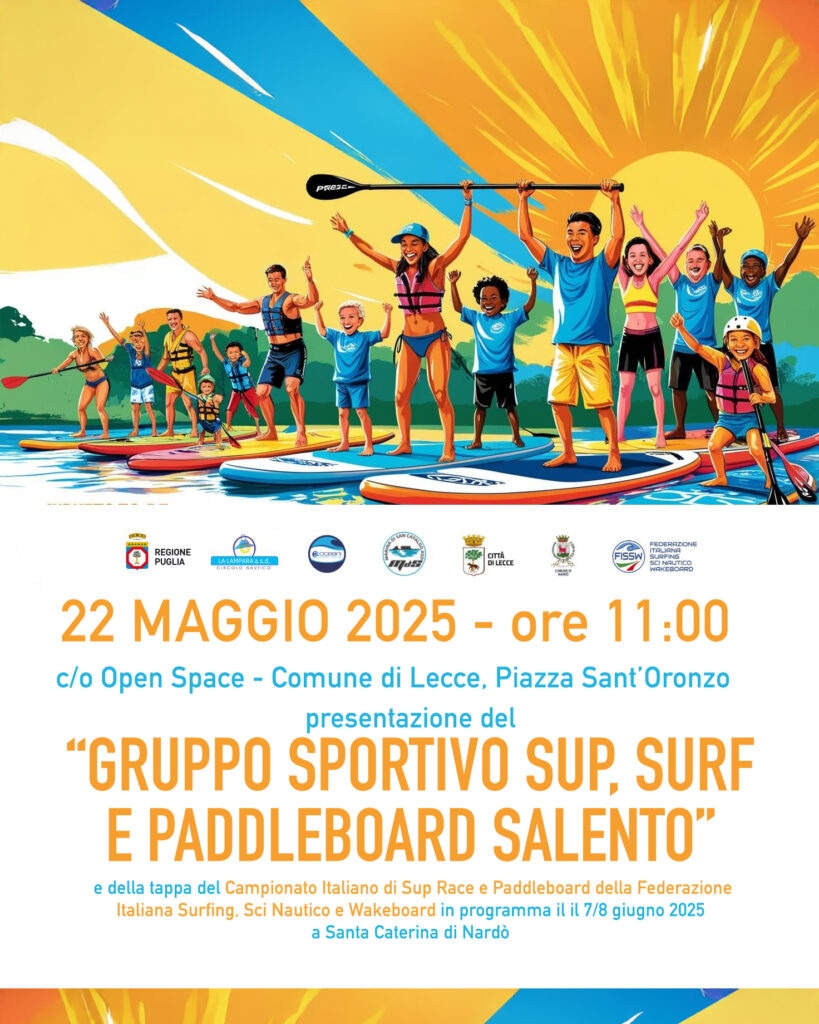 ๐๐ถ๐ผ๐๐ฒ๐ฑ๐ถฬ ๐ฎ๐ฎ ๐ ๐ฎ๐ด๐ด๐ถ๐ผ alle ore 11:00, presso lโOpen Space del Comune di Lecce, in ๐ฃ๐ถ๐ฎ๐๐๐ฎ ๐ฆ๐ฎ๐ป๐โ๐ข๐ฟ๐ผ๐ป๐๐ผ, alla presentazione del โ๐๐ฟ๐๐ฝ๐ฝ๐ผ ๐๐ฝ๐ผ๐ฟ๐๐ถ๐๐ผ ๐ฆ๐๐ฝ, ๐ฆ๐๐ฟ๐ณ ๐ฒ ๐ฃ๐ฎ๐ฑ๐ฑ๐น๐ฒ๐ฏ๐ผ๐ฎ๐ฟ๐ฑ ๐ฆ๐ฎ๐น๐ฒ๐ป๐๐ผโ ideato dalle Associazioni sportive ๐๐ถ๐ฟ๐ฐ๐ผ๐น๐ผ ๐ก๐ฎ๐๐๐ถ๐ฐ๐ผ ๐๐ฎ ๐๐ฎ๐บ๐ฝ๐ฎ๐ฟ๐ฎ, ๐ ๐ฎ๐ฟ๐ถ๐ป๐ฎ ๐ฑ๐ถ ๐ฆ๐ฎ๐ป ๐๐ฎ๐๐ฎ๐น๐ฑ๐ผ e ๐ง๐ฟ๐ฒ ๐ข๐ฐ๐ฒ๐ฎ๐ป๐ถ ๐ฃ๐ฎ๐ฑ๐ฑ๐น๐ฒ ๐ฆ๐๐ฟ๐ณ ๐๐ฒ๐ป๐๐ฒ๐ฟ, con il Patrocinio della FISSW – Federazione Italiana Surfing, Sci Nautico e Wakeboard.